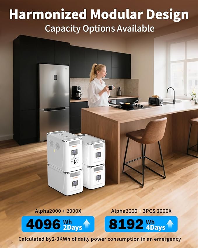 - 1 to 16 units Expansion: With a massive 2048Wh capacity, the HEPWAY Alpha 2000 supports up to 15 add-on battery packs at a time, expanding from 2.016kWh to a mighty 32kWh, ensuring 6-20 days of home backup power.