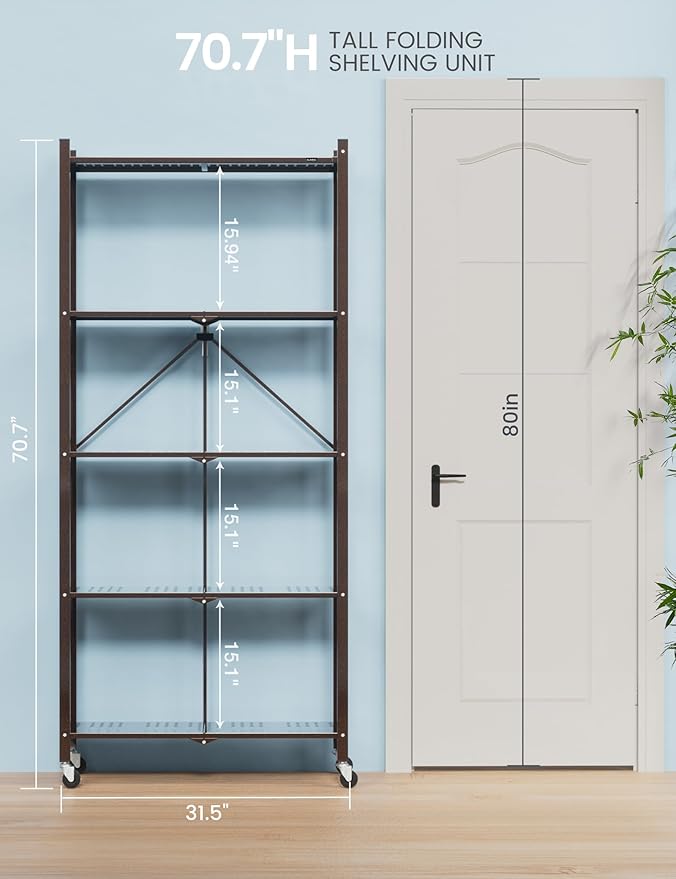 ALANNG 70.7" H Metal Storage Shelves, 5 Tier Folding Shelf on Wheels, Heavy Duty, No Assembly, Rolling, Collapsible Rack Unit for Kitchen, Basement, Pantry (Vintage Brown,4 Pack)