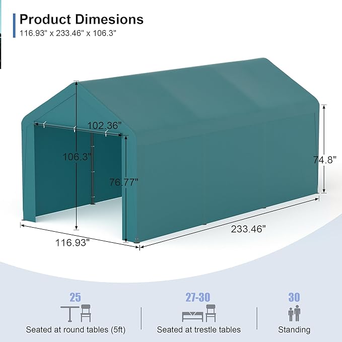 - 【Large Capacity Carport】The 10 x 20 FT canopy tent provides ample space for parking your car, truck, or boat. The triangular metal structure enhances the stability of the portable garage and comes with nylon ropes and ground nails to withstand strong winds.