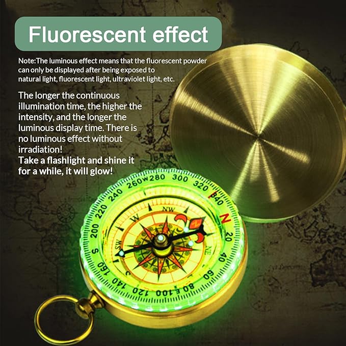 - Fluorescent Compass Design: This compass uses the same advanced luminous technology as military compasses. When the hiking survival compass is exposed to sunlight or any light, it can absorb energy and emit a bright light in the dark to illuminate the way forward. The longer the exposure time, the longer the glow time. Ensure that you will not lose your way in any weather conditions, and escort your every outdoor journey in all directions.