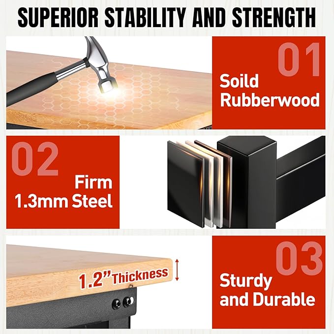 - PLEASE RECOGNIZE THE MUWOOD BRAND WHEN PURCHASING! SOLID RUBBER WOOD AND THICK STEEL: The tabletop is made of 66“ x 22” x 1.2” solid rubber wood. It is finely coated and polished for long life and easy cleaning. The steel is 1.3mm thick.Precision cutting process makes this workbench with 2000LBS weight capacity, ideal for auto repair projects and gardening.