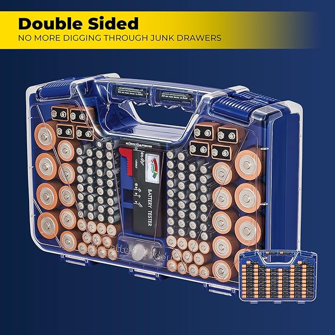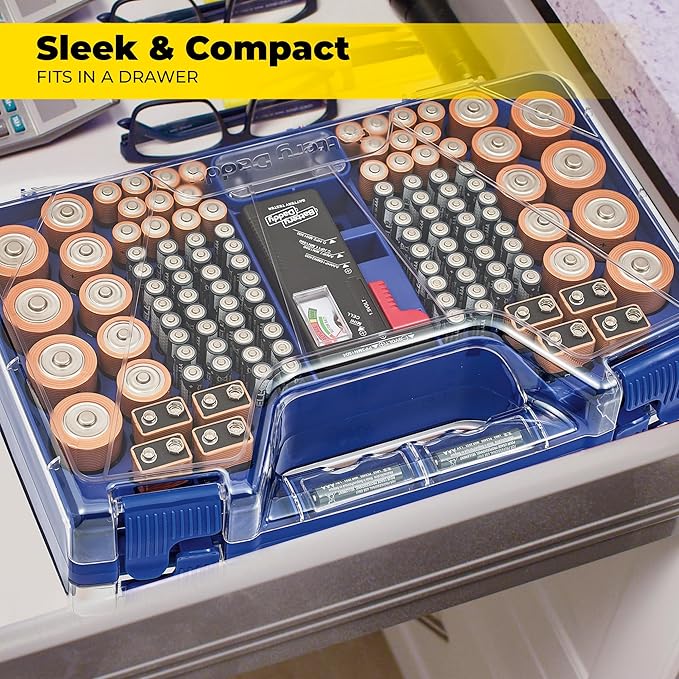 - Durable and Portable Design: With a clear locking lid, secure latches, and a built-in carrying handle for easy portability and storage in many drawers, shelves or emergency kits. Great for professionals, technicians or anyone needing batteries on the go
