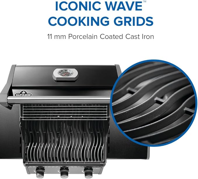 - CAST IRON COOKING GRATES: Porcelainized cast iron cooking grids provide even heating and the perfect sear on food. Reverse grids for larger sear marks, grooves hold juices against food while cooking to retain moisture