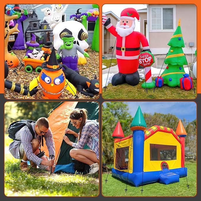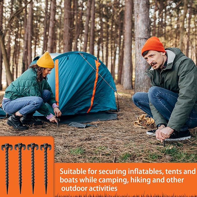 - Easy to Use: These tent stakes heavy duty have a long, pointed head and a spiral shape, which can be easily screwed into hard, dry soil and sand. Just insert plastic stakes into the soil, adjust screw in tent stakes to the angle you need, tie one end of the rope to the pile, and then tie the other end of the rope to the inflatables, which is very convenient to use