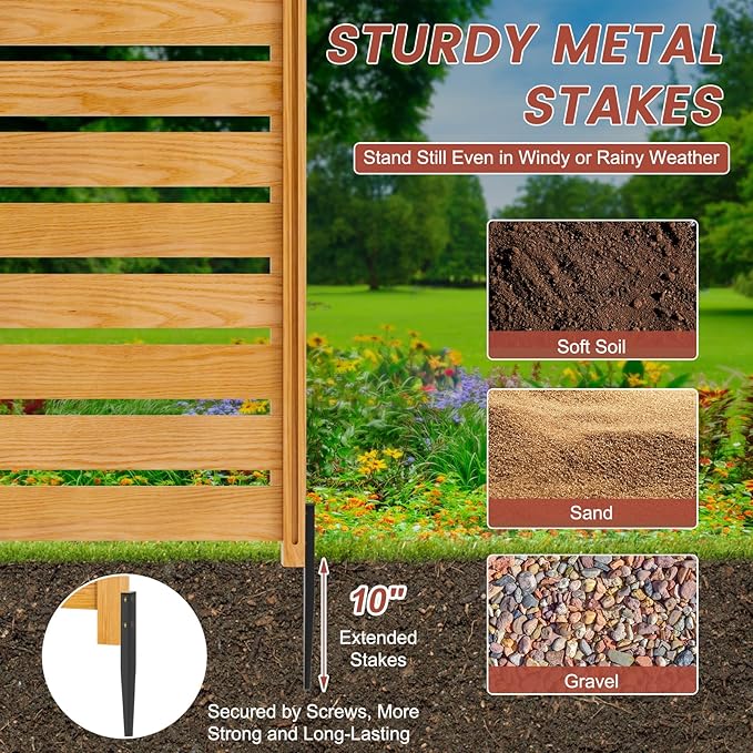 - Durable and Sturdy: It is equipped with 3 panels and 4 metal stakes, the fence panels are made of high-quality solid wood, which is weather-resistant, ensuring long-lasting outdoor use, the metal stakes can go deep into the ground up to 10 inches deep, ensuring good windproof performance, and the metal piles are not easy to overturn