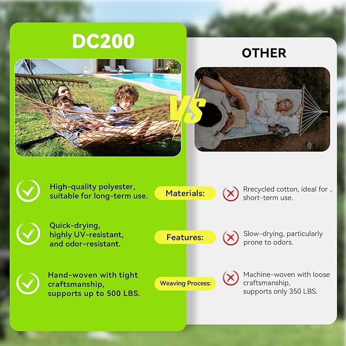 - Premium Polyester Material – Stronger & Longer-Lasting:Made from high-quality polyester fabric, this hammock outperforms cotton: ✔ Resists odors – Stays fresh even after prolonged use. ✔ Sun & rain-resistant – Won’t fade or weaken under UV rays or moisture. ✔ Quick-drying – Dries faster than cotton after rain or spills. ✔ Low maintenance – ideal for outdoor use.