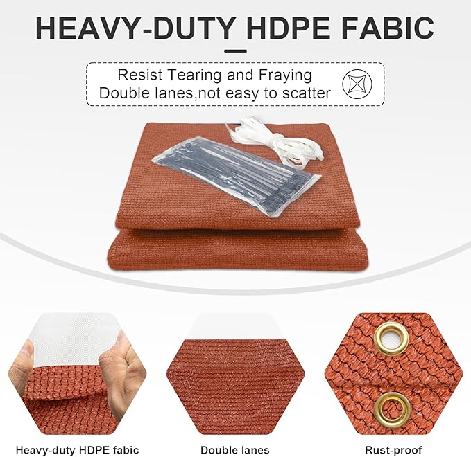 - ?�Easy to Install?‘Each shade cloth for patio is designed with heavy-duty copper grommets at 2 ft intervals, with included zip ties, ropes, and offers flexible mounting options. Please understand that due to the elasticity of the material, our shade cloth has a tolerance of ±2 inch.