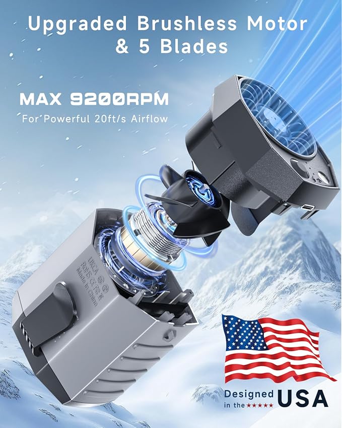 - 【4 Adjustable Speeds, Powerful Airflow】 This portable clip on fan offers 4 speed settings, from a gentle breeze to a strong gust, suitable for various environments. With an upgraded high-speed brushless motor and 5-blade turbo fan reaching 9200 RPM, it quickly cools your body. (Speeds 1-2 for quiet indoor use, speeds 3-4 for noisy outdoor use.)