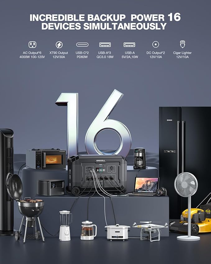 - POWER YOUR HOME WITH EASE - The GRECELL S5 power station features 16 outlets – 6 AC outlets, 4 USB-A, 2 USB-C, 2 DC, 1 XT90, and 1 cigarette lighter. With a 5040Wh capacity and 4000W output (7000W peak), it powers 99.9% of home appliances, from electric vehicles to refrigerators, coffee makers, and more. The 30A RV outlet ensures reliable power for RVs or travel trailers, making it perfect for long trips.
