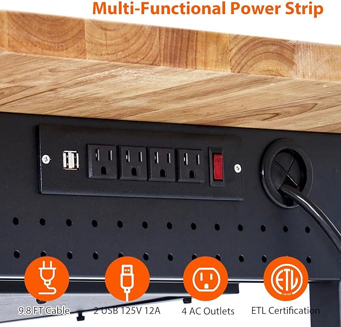 - 【Power Convenience】 Stay powered with the 60" workbench featuring a built-in ETL certified power strip with four AC outlets and two USB ports. This workbench provides convenience and safety for using power tools and devices, making it a versatile work table for garage or workshop environments, enhancing efficiency and organization.