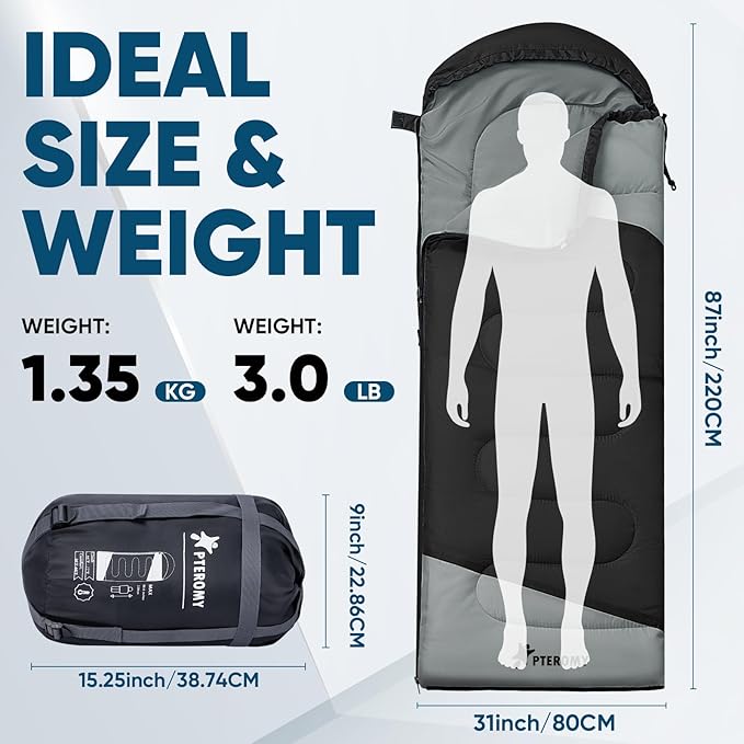 PTEROMY Sleeping Bags for Adults, Lightweight Water Resistant Backpacking Camping Sleeping Bag for Warm Cold Weather, Camping Essentials for Hiking Outdoor Travel