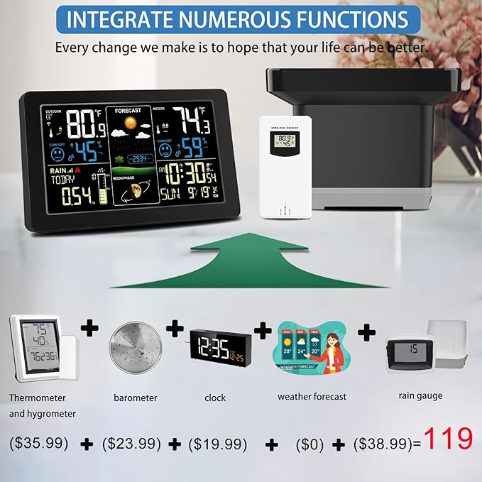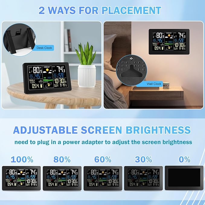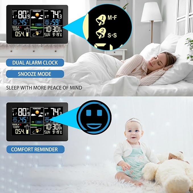 - Multi-functional and Stylish Weather Station --- This home weather station provides extensive information, including rainfall measurement, indoor/outdoor temperature and humidity, air pressure history, moon phase display, weather forecast and trend tracking, outdoor index monitoring, and more. Additionally, it features a dual alarm clock with snooze function and calendar for practical everyday use.