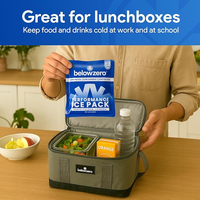 - COMPACT 7.5"x6.5" ICE PACK FOR POWERFUL CHILLING – Don’t let the size fool you—this small but mighty ice pack keeps food and drinks colder for hours. Ideal for lunch bags, personal coolers, and meal prep without leaks or mess.