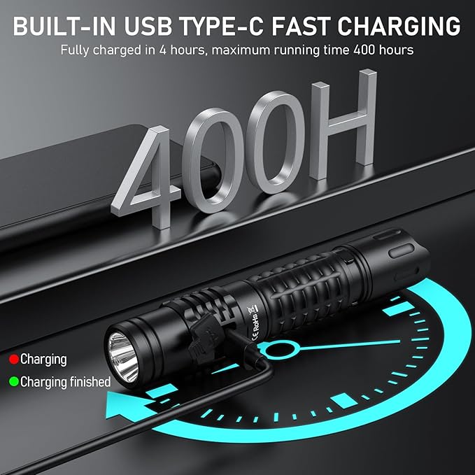 - USB-C RECHARGEABLE FLASHLIGHT - Fully charged in 1 hour and 50 minutes(5V2A) with a runtime of 16 days and 16 hours at the least lumens, it has the power required for even the darkest of nights.When the battery level is low (0%-30%), the red light will keep flashing,lets you know the power status of the handheld flashlights in real time.
