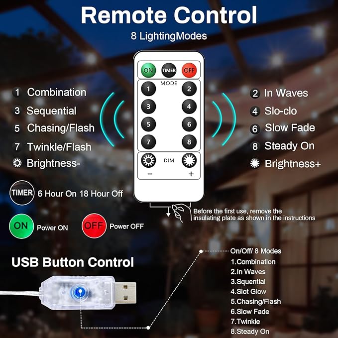 - 8 Lighting Modes & Timer: Our starry string lights offer 8 modes to cater to your every lighting need; including combination, wave, continuous, slow fading, chasing flash, gradually disappearing, flashing, and always on; The timer function for 6 hours on / 18 hours off, which will cycle automatically for 24 hours; Two control methods, use the remote control or the blue button on the USB plug to change the lighting mode, brightness, and timer switch of the starry string light
