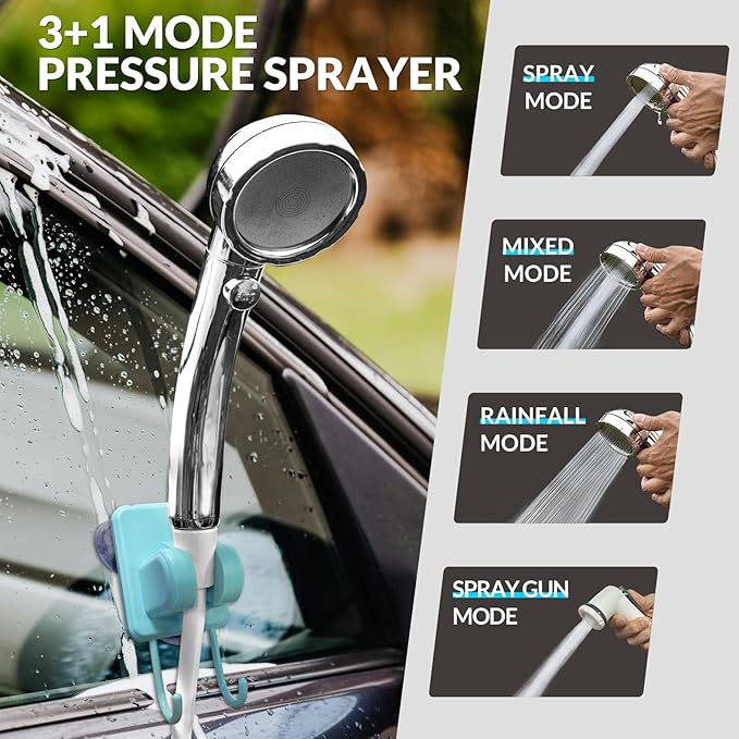 - [Extra Spray Gun&Multi-use hook] The separate spray gun can be used to wash cars, clean things, and water flowers. Benefit from the adjustability of sliding bracket that shower head can be adjusted up and down for wider flow range. Equipped with 3-in-1 hook and suction cup let you hang the shower head securely on tree branches, tent stand, cars or mount it on car windows.