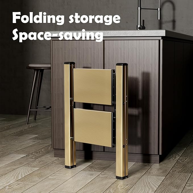 HillhutApex 2 Step Stool, Aluminum Foldable Step Ladder, Lightweight Stable Stool with Wide Non-Slip Pedals, 330lbs Bearing Capacity Ladder for Office,Home,Kitchen - Gold