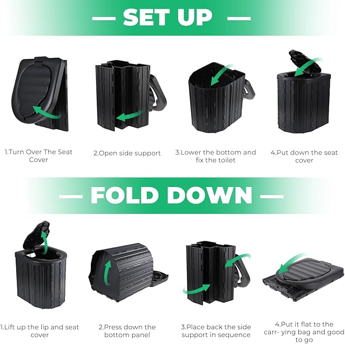 - 🎒Compact and portable: Folds smaller than a standard backpack! And includes a storage bag for instant grab-and-go readiness. 60% smaller than 5-gal buckets when folded, ensuring effortless storage in cars, RVs, or tight spaces. This portable toilet is a must-have for campers, hikers, hunters, anglers, road trips, RV living, van life, long trips, traffic jam, car travel or anyone venturing into the outdoors. Your lightweight solution to nature's call, anywhere!