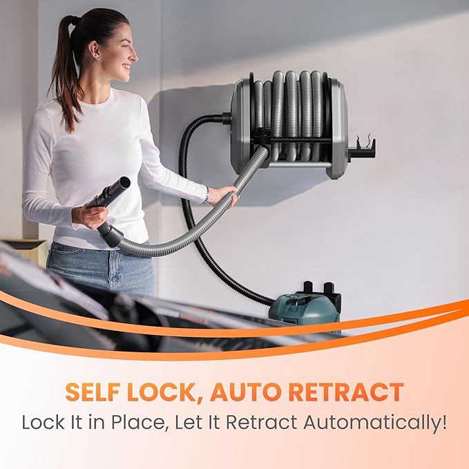 - Any Length Lock: The vacuum hose reel is pre-installed with 30 ft hose, which can lock at any length as you desired, covers every corner of your garage.