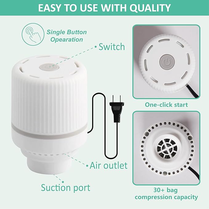 - Powerful electric pump for fast & easy compression: Our vacuum seal bags feature an electric pump, achieving rapid vacuum and reducing the need for manual effort compared to traditional hand pump. Lightweight and compact, you can carry it for easy use anywhere.
