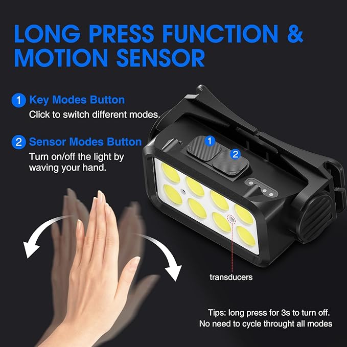 - Long Press Function and Motion Sensor: The Sogdeco headlamp's long-press function eliminates the hassle of cycling through modes—just hold the button for 3 seconds to turn off the light instantly. The motion sensor mode adds another layer of convenience: wave your hand from up to 12 cm away to activate or control the light, making it ideal for hands-full scenarios, dirty conditions, gloved use, or emergency moments. Whether you’re hiking, working, or responding to an urgent situation, this head lamps led rechargeable ensures you stay focused on the task at hand