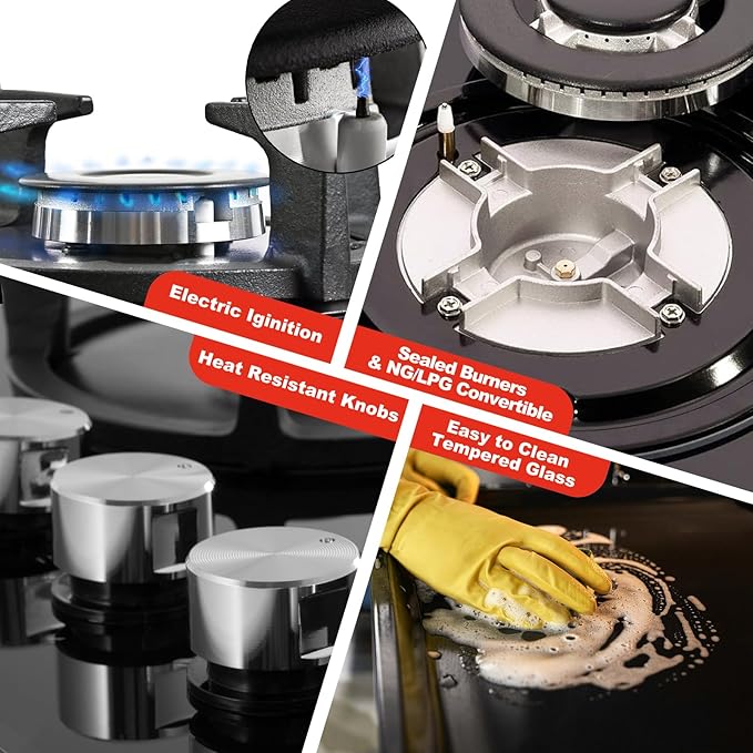 - ✨ Tempered Glass Gas Stove Top – Sleek, Durable, and Easy to Clean The 30 inch gas stove features a black tempered glass surface that’s heat and corrosion-resistant, easier to clean than stainless steel, and adds a modern touch to your kitchen. Smooth edges prevent debris from accumulating, making wipe-downs effortless.