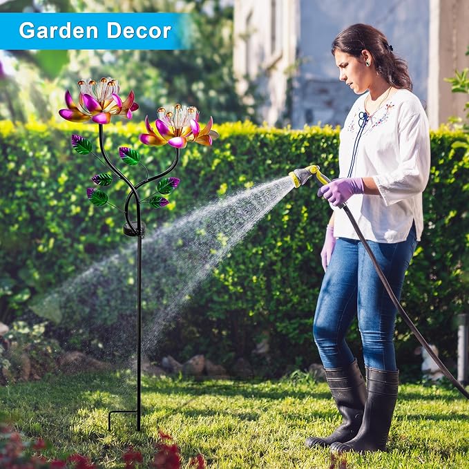 55'' Solar Powered Kinetic Wind Spinner Sculpture Pink Lotus Metal Stake Spinner for Patio, Lawn and Garden Decor Weather-Resistant Outdoor Art with Dual Lotus Design