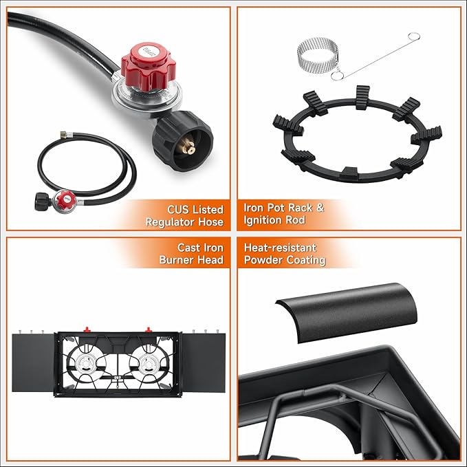 - Premium Heavy-Duty Material: This 2 burner propane stove features a weather-resistant powder-coated finish and reinforced iron construction, delivering unmatched durability for outdoor cooking stoves. Come with CUS Listed Regulator Hose. It's perfect for RV cooking equipment, camping trips, and backyard barbecues.