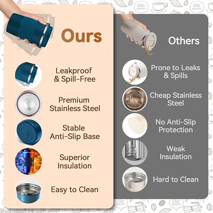 - Superior Thermal Insulation: Featuring advanced double-wall vacuum insulation, this travel mug effectively preserves the temperature of your beverage without causing heat transfer or condensation on the outer surface. Whether you're enjoying a hot brew or a cold refreshment, your drink stays enjoyable from the first sip to the last.