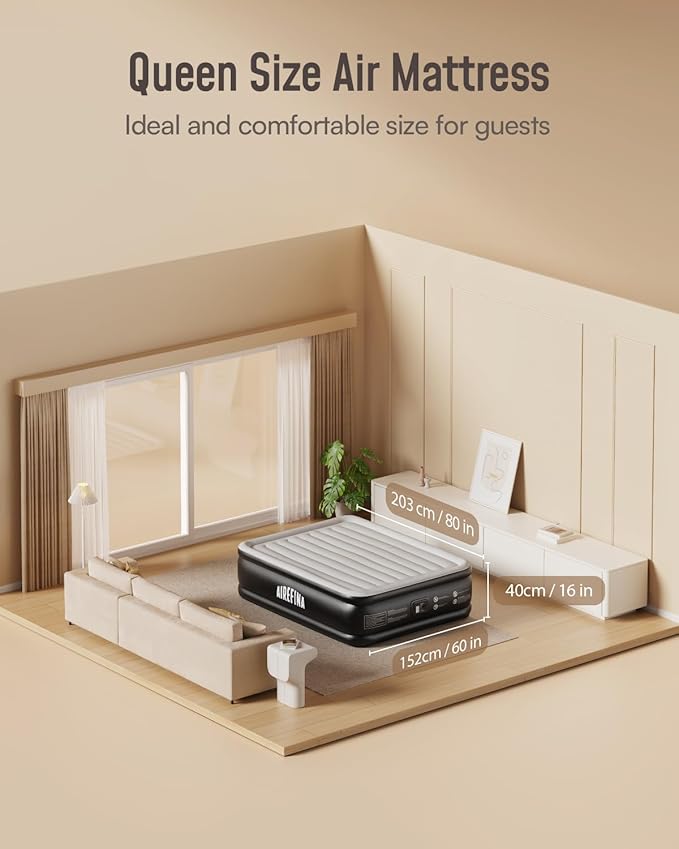 Airefina Queen Air Mattress with Built in Pump, Upgraded Comfort Blow Up Mattress Raised Inflatable Mattress for Guest Home Temporary Camping, Air Bed Queen Size, Colchones Inflables, 700lbs Max