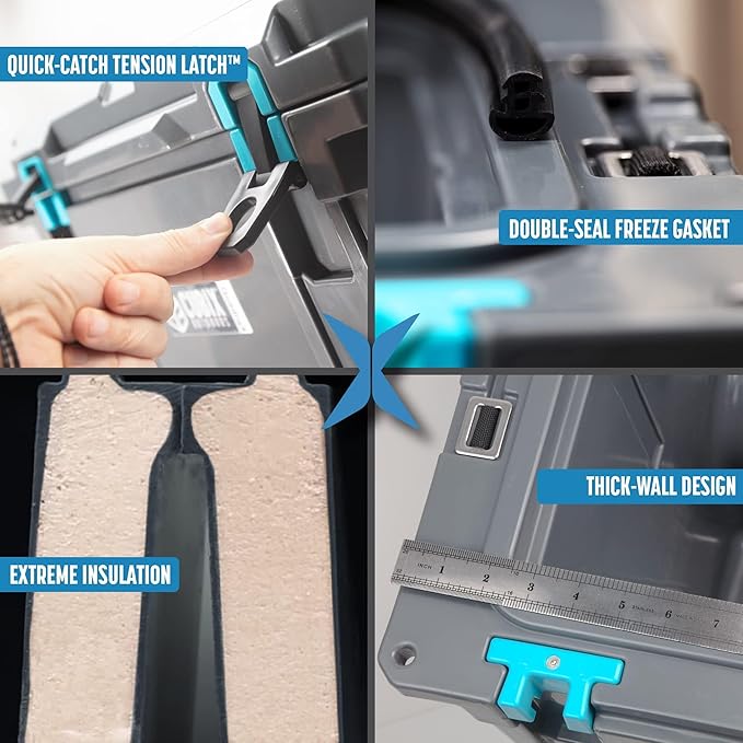- 5 DAY COLD RETENTION: QuadraX rolling cooler will keep your contents cool for up to 5 days with our thick-wall sided design featuring 3 inches of superior insulation; impressive carrying capacity of up to 26 cans with a recommended 2:1 ice-to-contents ratio.