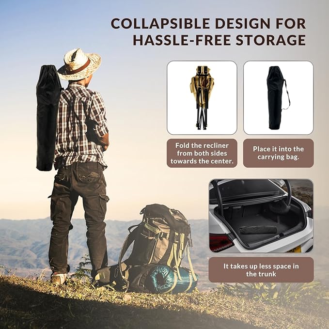 - Detachable Headrest and Footrest: Enjoy customizable comfort with our reclining camping chair featuring a detachable headrest and footrest. Easily adjust or remove these features to suit your relaxation preferences and storage needs.