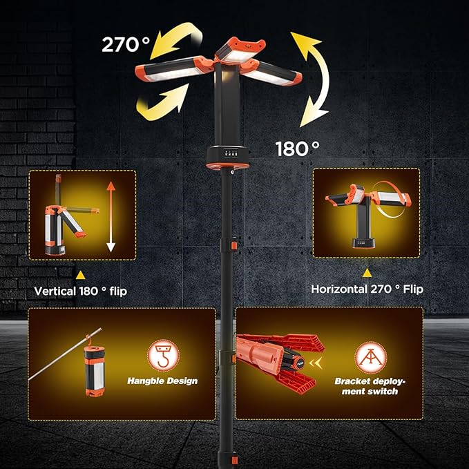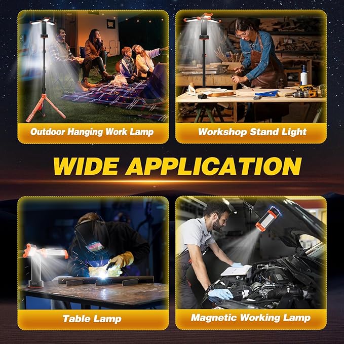 - Versatile Usage Scenarios: This rechargeable work light with a stand supports multiple configurations: as a tripod-mounted light, magnetic flashlight, hanging light, or table lamp. Perfect for garages, camping trips, outdoor gatherings, it’s a reliable tool for any situation.
