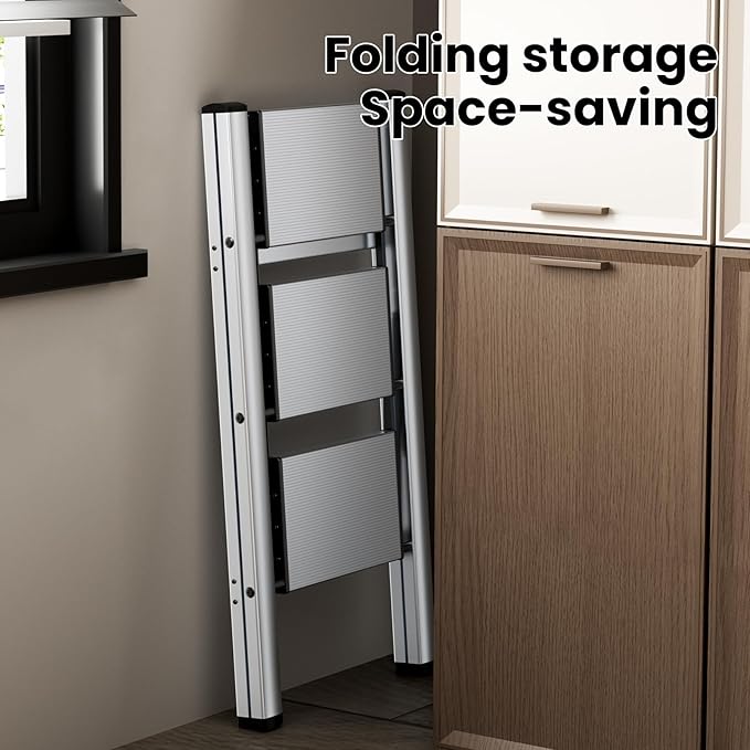 HillhutApex 3 Step Stool, Aluminum Foldable Step Ladder, Lightweight Stable Stool with Wide Non-Slip Pedals, 330lbs Bearing Capacity Ladder for Office,Home,Kitchen - Silver