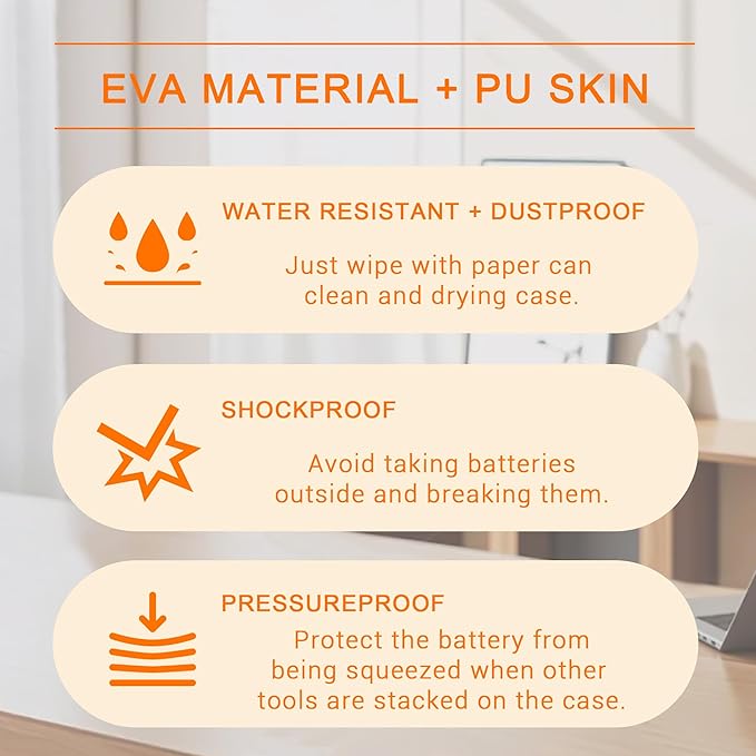 - 【PROTECT BATTERY】 Hard EVA case is shockproof and pressureproof, hard shell and internal sponge act as a shock absorber when the battery case is subjected to external forces such as knocking or dropping.