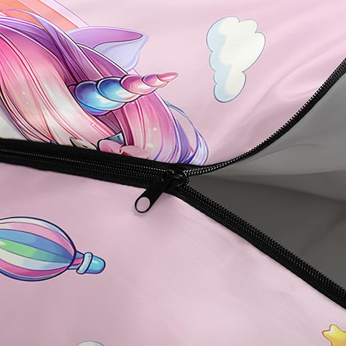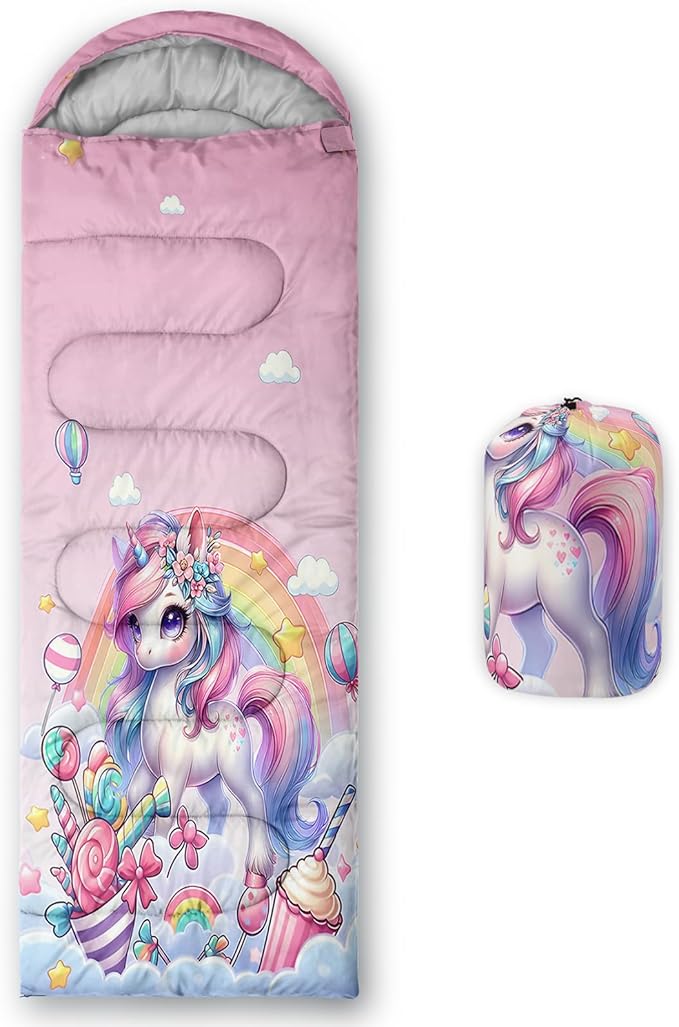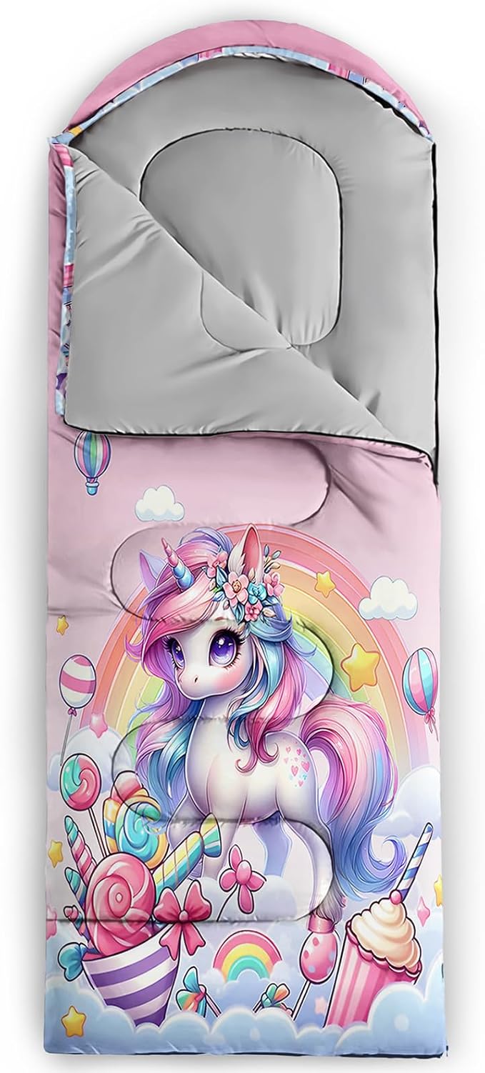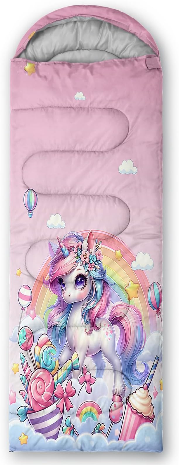 - 【Fashion Design】This waterproof and lightweight sleeping bag is designed with a cartoon unicorn pattern.Various patterns on this girl sleeping bag including candy,dessert,balloon and rainbow,adding a comfortable atmosphere.