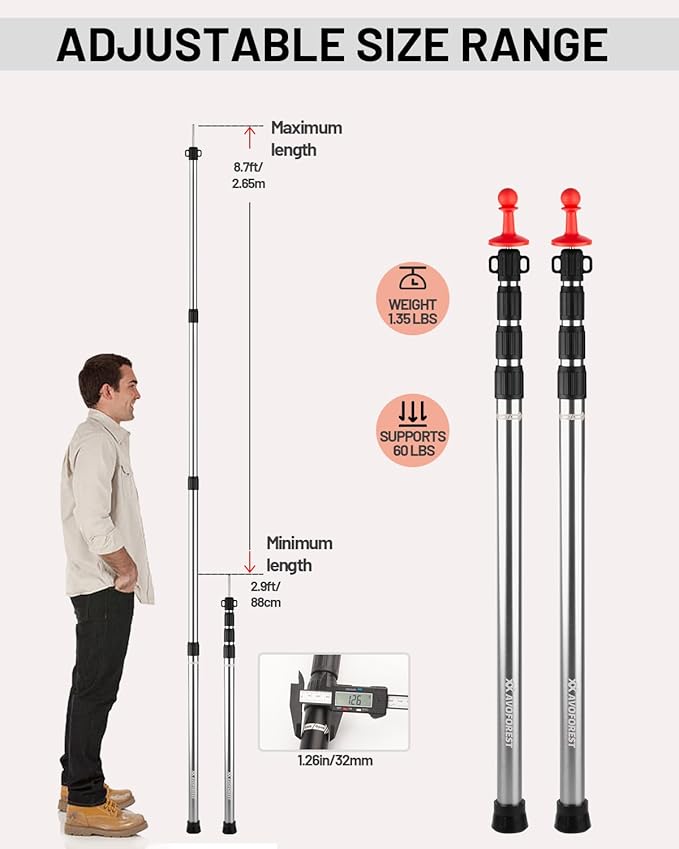 - 2024 LATEST VERSION OF TELESOPIC TARP POLES: the diameter of the tarpaulin pole is increased to 1.26in/32mm, the height is increased to 8.7ft/2.65m, the minimum storage size is 2.9ft/88cm, each pole can bear a load of up to 60LBS,The entire pole is made of aviation aluminum, waterproof and rust-proof