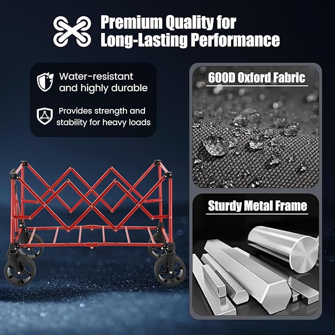 - 【Carry More & Less Effort】The collapsible wagon features a reinforced metal frame that supports up to 360 lbs. The oversized 150L interior (33" x 18.5" x 16") gives you plenty of room for groceries, camping gear, sports equipment, or garden tools. Includes a removable 600D Oxford fabric liner that’s waterproof, easy to clean, and made to handle heavy use. Two mesh cup holders keep your drinks stable and within easy reach on the go.