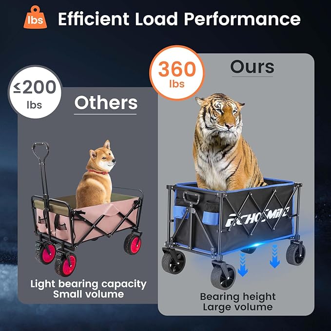 - 【Carry More & Less Effort】The collapsible wagon features a reinforced metal frame that supports up to 360 lbs. The oversized 150L interior (33" x 18.5" x 16") gives you plenty of room for groceries, camping gear, sports equipment, or garden tools. Includes a removable 600D Oxford fabric liner that’s waterproof, easy to clean, and made to handle heavy use. Two mesh cup holders keep your drinks stable and within easy reach on the go.