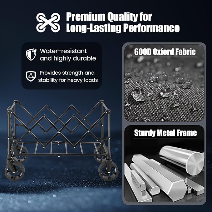 - 【Carry More & Less Effort】The collapsible wagon features a reinforced metal frame that supports up to 360 lbs. The oversized 150L interior (33" x 18.5" x 16") gives you plenty of room for groceries, camping gear, sports equipment, or garden tools. Includes a removable 600D Oxford fabric liner that’s waterproof, easy to clean, and made to handle heavy use. Two mesh cup holders keep your drinks stable and within easy reach on the go.