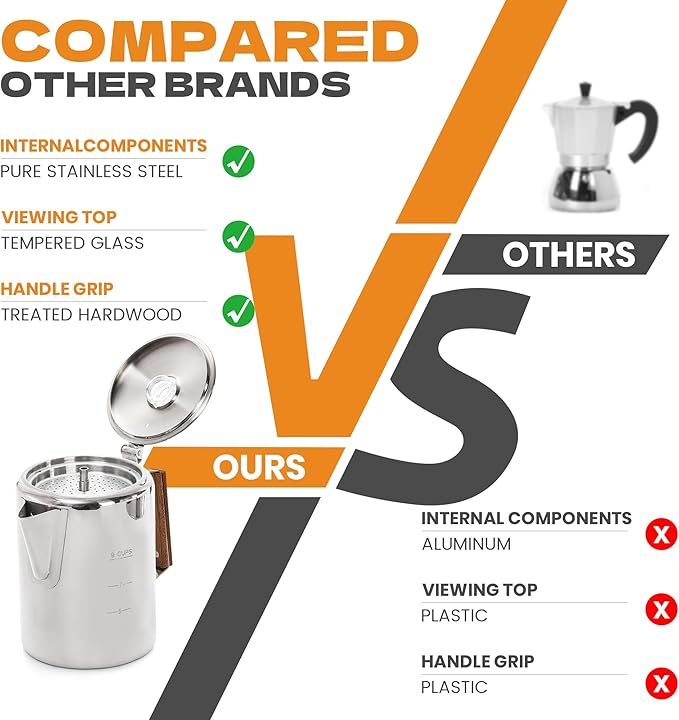 Percolator Pot Stainless Steel Camping Coffee Pot-NO Aluminum or Plastic Camping Coffee Pot Stovetop (9 cup)