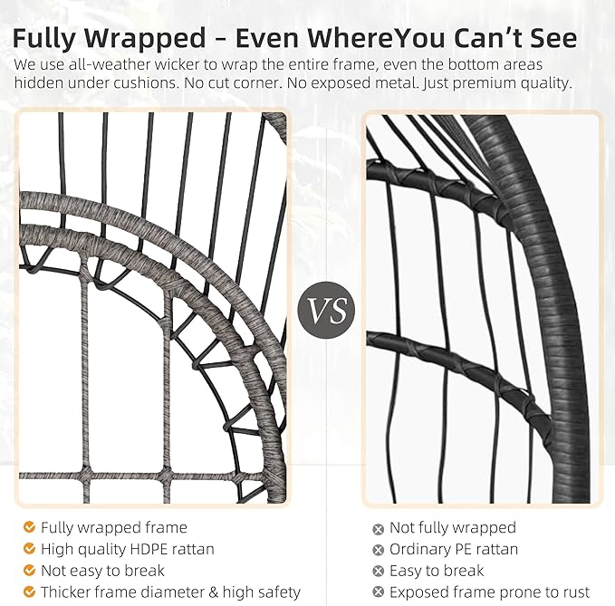 - 【Heavy-Duty Steel Frame & Adjustable Suspension Chain】Built with a reinforced aluminum-steel frame and a heavy-duty steel stand, this egg swing chair provides exceptional stability and weight capacity of up to 350 lbs. The adjustable hanging chain allows you to customize the seat height for maximum comfort, accommodating different users effortlessly.