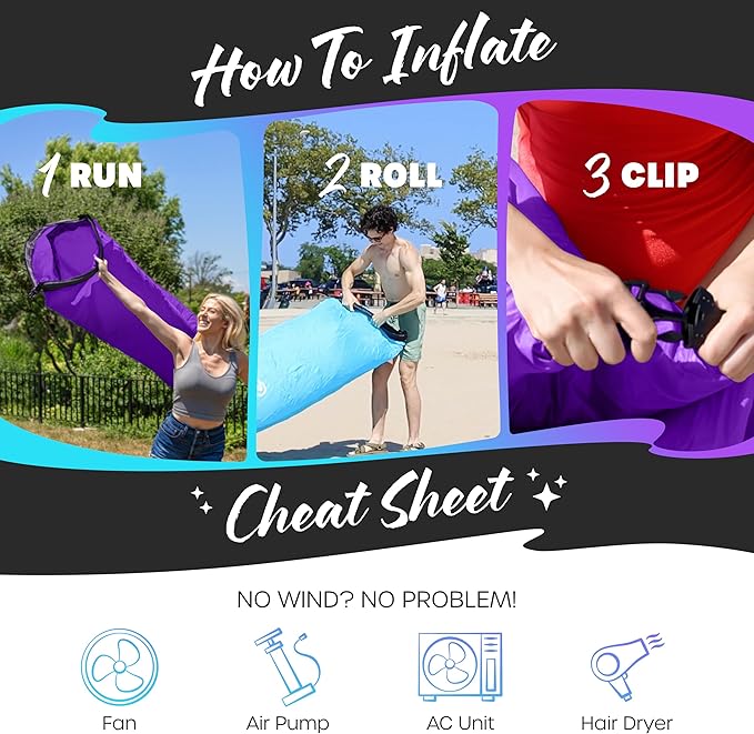 - WIND OPTIONAL SET UP: Setting up the Nevlers Inflatable Sofa is as easy as 1-2-3! Simply run a few feet, roll it up, then clip it to have your beach lounge chair ready in no time. No wind? No worries! Even if there's no breeze, you can use a fan or air pump to inflate our blow up couch for adults & kids. When it's time to pack up, deflate & fold the portable hammock into the drawstring bag for lightweight storage. No need to lug around bulky seating with our convenient inflatable lounge chair .