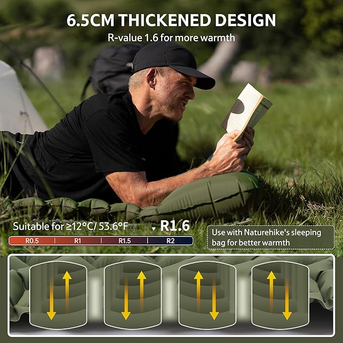 - ERGONOMIC DESIGN: Naturehike sleeping pad according to the curve of the human back and stress points, using more than 70 large air bag protrusion contact points, to give your body better support while maintaining a certain amount of soft rebound, so that you sleep for a long time not tired. Ergonomic design of the pillow to protect your shoulders and neck