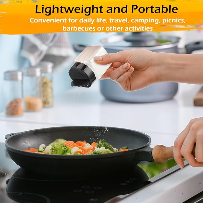 - 2 Independent Flip Lids: the flip lid design of the plastic seasoning container is smart and thoughtful, it can meet the precise amount of cooking, you can take it as you go, you don't have to remove the lid to measure the spices, if you just want to sprinkle the spices, the holes on the side of the shaker are large enough to allow dried herbs to pass through