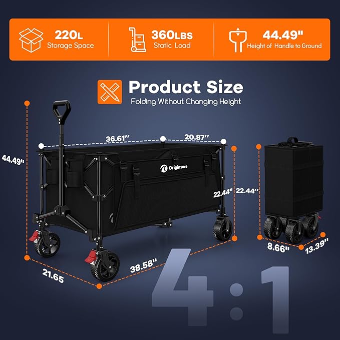 - ใ๐ณ.๐ฒ๐ต ๐ฐ๐ ๐ณ๐ ๐๐ฎ๐ฟ๐ด๐ฒ ๐๐ฎ๐ฝ๐ฎ๐ฐ๐ถ๐๐ ๐๐ถ๐๐ต ๐ฆ๐บ๐ฎ๐น๐น๐ฒ๐ฟ ๐๐ผ๐น๐ฑ๐ฒ๐ฑ ๐ฆ๐ถ๐๐ฒ ๐ฃ๐ผ๐ฟ๐๐ฎ๐ฏ๐น๐ฒ ๐๐ผ๐น๐น๐ฎ๐ฝ๐๐ถ๐ฏ๐น๐ฒ ๐๐ฒ๐ฎ๐ฐ๐ต ๐ช๐ฎ๐ด๐ผ๐ปใOriginsure foldable wagon cart, 38.58 "L x 21.65 "W x 22.44 "H large unfolding size, 7.69cu ft/220L massive storage space, double the capacity of similar wagons. Adopting an innovative folding design that maintains its height, the Capacity reduces to 1.36 cu ft when folded, only 1/3 of other carts. Compact and space-saving, it can be perfectly stored in the car trunk and room corners.
