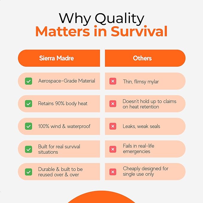 - DURABLE & REUSABLE: Unlike flimsy emergency space blankets, our survival bag is tough enough for multiple uses. Just fold it up and store it back in the drawstring stuff sack for your next adventure.VERSATILE USE; A SURVIVAL ESSENTIAL: According to the Red Cross, the elements are the #1 killer in any crisis situation. Whether you're a backpacker, hiker, prepper, or a parent, the Sierra Madre Emergency Sleeping Bag is a must-have—because safety should never be an afterthought.