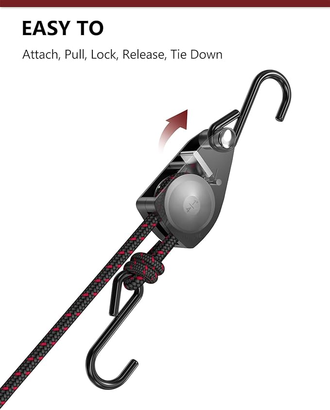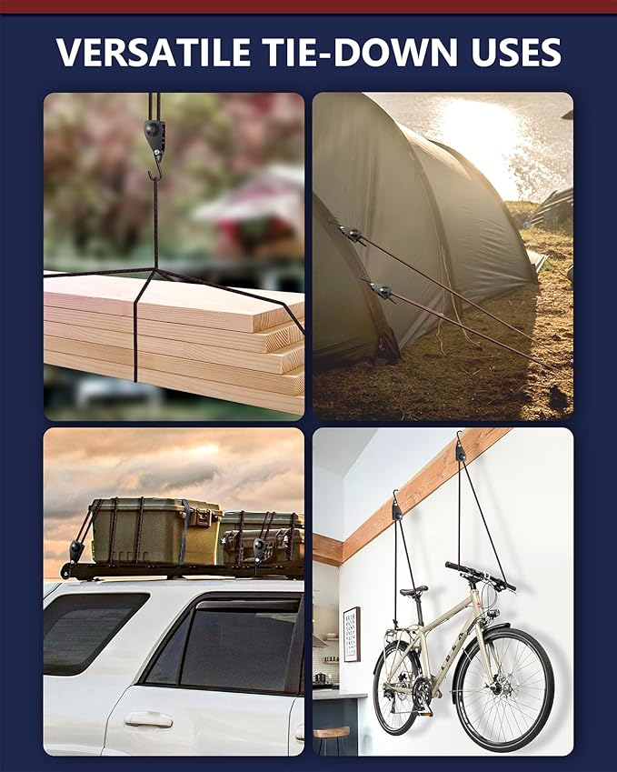 - Widely Applicable: The rope tie-downs are perfect for securing kayaks & canoes, stabilizing loads in trucks, and serving as versatile solutions for securing items like tarps, covers, camping tents, bags, canopies, awnings, and banners