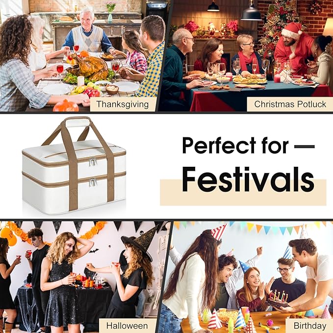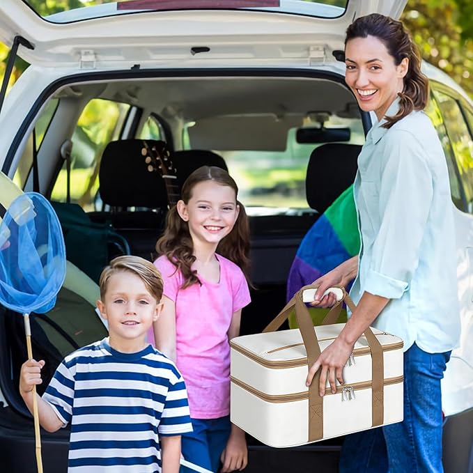 Double Insulated Casserole Carrier, Portable Casserole Carrier for Hot or Cold Food Lunch Tote Warmer or Cooler Bag, Lasagna Lunch Bag for Potluck Parties- Fits 9" x 13" Baking Dish-Beige