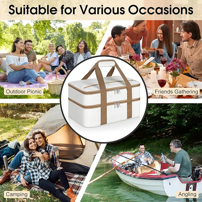 - Versatility: Insulated food carrier with its large capacity, simple and versatile color options, and lightweight construction, our insulated bag is perfect for storing and transporting food to potluck parties, picnics, tailgates, BBQs, and cookouts.